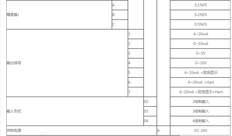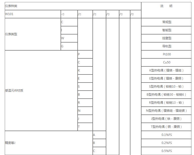 2、設定值參照表選型舉例:W1010-ZP1OSBU-023M0-150W10裝配型溫度傳感器,感溫元件為熱電阻Pt100,BJ精度,固定螺紋連接,直徑16的不銹鋼保護管,防水接線盒,插入深度150
